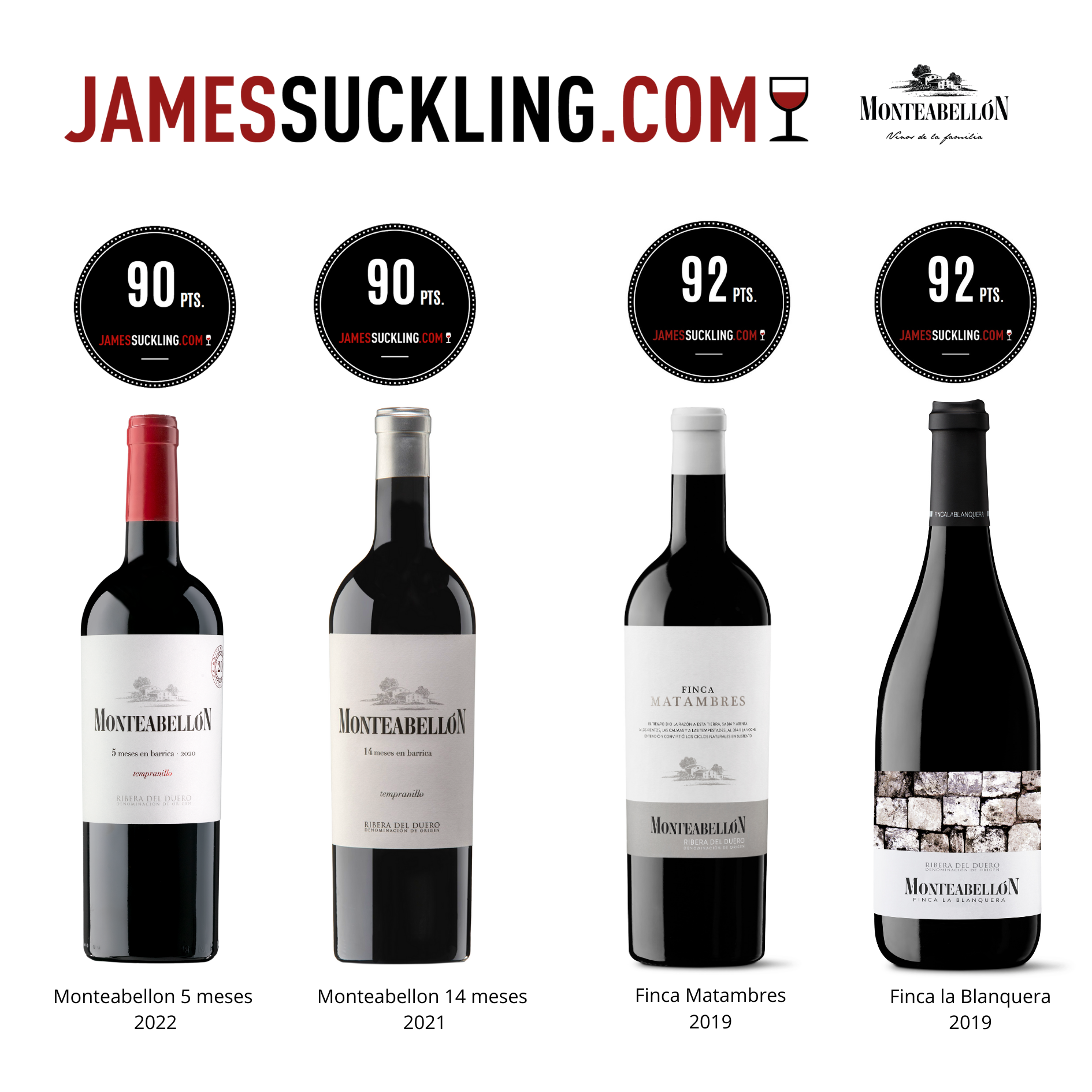 Monteabellon 5 meses 2022 y Monteabellon 14 meses 2021, el Roble y el Crianza de Monteabellón respectivamente, alcanzaron los 90 puntos., Y sus dos vinos de parcela, Finca Matambres y Finca La Blanquera, ambos de la añada 2019, llegaron hasta los 92 puntos en cata por el prestigioso Suckling.